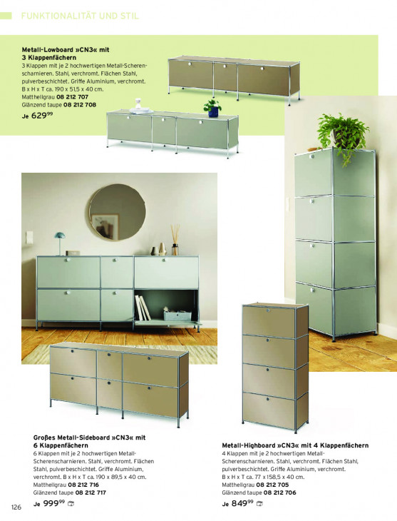 Bitte beachten Sie, dass dieser Text automatisch generiert wird und möglicherweise Fehler enthältMetall-Lowboard »CN3« mit = 3 Klappenfächern en 3 Klappen mit je 2 hochwertigen Metall-Scheren- scharnieren. Stahl, verchromt. Flächen Stahl, pulverbeschichtet. Griffe Aluminium, verchromt. BXHXT ca.190x 515x 40cm. J Matthellgrau 08 212 707 nl] Glänzend taupe 08 212 708 Je 629% + z | | | k A| be zu ee Jm = en nn | NN an = ” & = y N N N‘ N 4 I R > = 4 N À = Großes Metall-Sideboard »CN3« mit 6 Klappenfächern Metall-Highboard »CN3« mit 4 Klappenfächern 6 Klappen mit je 2 hochwertigen Metall- 4 Klappen mit je 2 hochwertigen Metall- Scherenscharnieren. Stahl, verchromt. Flächen Scherenscharnieren. Stahl, verchromt. Flächen Stahl, Stahl, pulverbeschichtet. Griffe Aluminium, pulverbeschichtet. Griffe Aluminium, verchromt. verchromt. B x H x T ca. 190 x 89,5 x 40 cm. Bx Hx T ca. 77 x158,5 x 40 om. Matthellgrau 08 212 716 Matthellgrau 08 212 705 Glänzend taupe 08 212 717 Glänzend taupe 08 212 706 126 Je 9999 m Je 849” 7