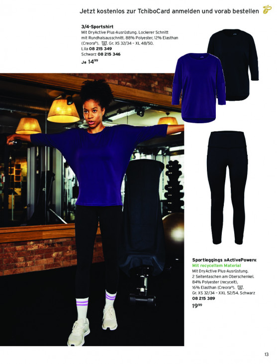 Bitte beachten Sie, dass dieser Text automatisch generiert wird und möglicherweise Fehler enthältJetzt kostenlos zur TchiboCard anmelden und vorab bestellen F 3/4-Sportshirt Mit DryActive Plus-Ausrüstung. Lockerer Schnitt mit Rundhalsausschnitt. 8: % Polyester, 12% Elasthan (Creoraf j. W. Gr. XS 32/34 - XL 48/50. Lila 08 215 349 Schwarz 08 215 346 FEN Je 14°° nl b = » Ff pe LP iii, le == 2 = Sportieggings »ActivePower« Mit recyceltem Material Mit DryActive Plus-Ausrüstung. 2 Seitentaschen am Oberschenkel. 84% Polyester (recycelt), 1 6 Elasthan (Creor: u. a: Gr. XS 32/34 - XXL 52/54. Schwarz 08 215 389 1999 13