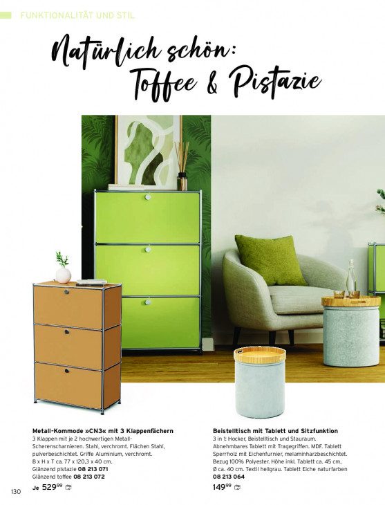 Bitte beachten Sie, dass dieser Text automatisch generiert wird und möglicherweise Fehler enthältgchèn rafürlich Pf ehtee & — | m | | Il 5) BE - er Ke à | — an en Re a eur ua À — Metall-Kommode »CN3« mit 3 Klappenfächern Beistelltisch mit Tablett und Sitzfunktion 3 Klappen mit je 2 hochwertigen Metall- 3in 1: Hocker, Beistelltisch und Stauraum. Scherenscharnieren. Stahl, verchromt. Flächen Stahl, ‚Abnehmbares Tablett mit Tragegriffen. MDF. Tablett pulverbeschichtet. Griffe Aluminium, verchromt. Sperrholz mit Eichenfurnier, melaminharzbeschichtet. Bx Hx T ca. 77 x 120,3 x 40 cm. Bezug 100% Polyester. Höhe inkl. Tablett ca. 45 cm, Glänzend pistazie O8 213 071 9 ca. 40 cm. Textil hellgrau. Tablett Eiche naturfarben Glänzend toffee 08 213 072 08 213 064 130 Je 529° 7 149% &