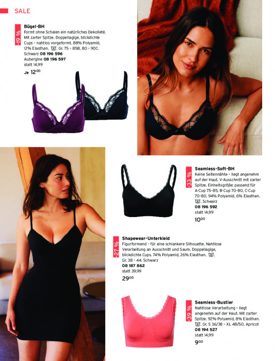 Bitte beachten Sie, dass dieser Text automatisch generiert wird und möglicherweise Fehler enthält3 # Pr Bügel-BH Formt ohne Schalen ein natürliches Dekolleté. Ne Mit zarter Spitze. Doppellagige, blickdichte Cups - nahtlos vorgeformt. 88% Polyamid, 12% Elasthan. [8]. Gr. 75 - 85B, 80 - 90C. Schwarz 08 196 596 Aubergine 08 196 597 statt 1499 Rs. | Je 12% ji) Pr / zn Zi di Ki 5 Li Eg Zi EA 5 ki ni $ Seamless-Soft-BH Keine Seitennähte - liegt angenehm auf der Haut. V-Ausschnitt mit zarter Spitze. Einheitsgröße: passend für A-Cup 75-85, B-Cup 70-80, C-Cup N 70-80. 94% Polyamid, 6% Elasthan. WI. Schwarz 08 196 592 Y statt 14,99 1000 Shapewear-Unterkleid Figurformend - für eine schlankere Silhouette. Nahtlose Verarbeitung an Ausschnitt und Saum. Doppellagige, blickdichte Cups. 74% Polyamid, 26% Elasthan. @. Gr. 38 - 44, Schwarz 08 187 862 statt 39,99 goo Seamless-Bustier Nahtlose Verarbeitung - liegt angenehm auf der Haut. Mit zarter Spitze. 92% Polyamid, 8% Elasthan. WI. Gr. S 36/38 - XL 48/50. Apricot 08 194 527 statt 14,99 goo