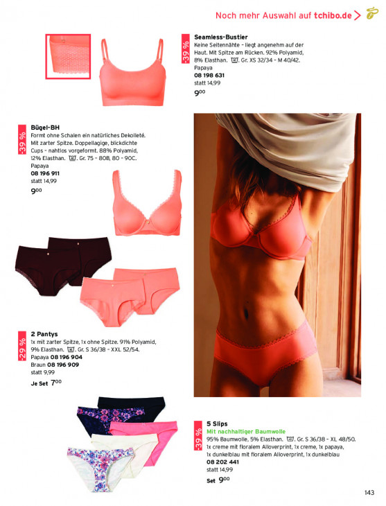 Bitte beachten Sie, dass dieser Text automatisch generiert wird und möglicherweise Fehler enthältSeamless-Bustier Keine Seitennähte - liegt angenehm auf der Haut. Mit Spitze am Rücken. 92% Polyamid, 8% Elasthan. W. Gr. XS 32/34 - M 40/42. Papaya 08 198 631 statt 14,99 goo N Bügel-BH Formt ohne Schalen ein natürliches Dekolleté. Mit zarter Spitze. Doppellagige, blickdichte Cups - nahtlos vorgeformt. 88% Polyamid, 12% Elasthan. 1]. Gr. 75 - 80B, 80 - 90C. Papaya 08 196 911 statt 14,99 goo |, | 2 Pantys = 1x mit zarter Spitze, 1x ohne Spitze. 91% Polyamid, 9% Elasthan. WI. Gr. S 36/38 - XXL 52/54. Papaya 08 196 904 Braun 08 196 909 statt 9,99 Je set 700 5 Slips Mit nachhaltiger Baumwolle 95% Baumwolle, 5% Elasthan. al. Gr. S 36/38 - XL 48/50. ä 5 1x creme mit floralem Alloverprint, 1x creme, Ix papaya, he ted Ce 1x dunkelblau mit floralem Alloverprint, 1x dunkelblau ne I 08 202 441 statt 1499 ke F set 900 # 143