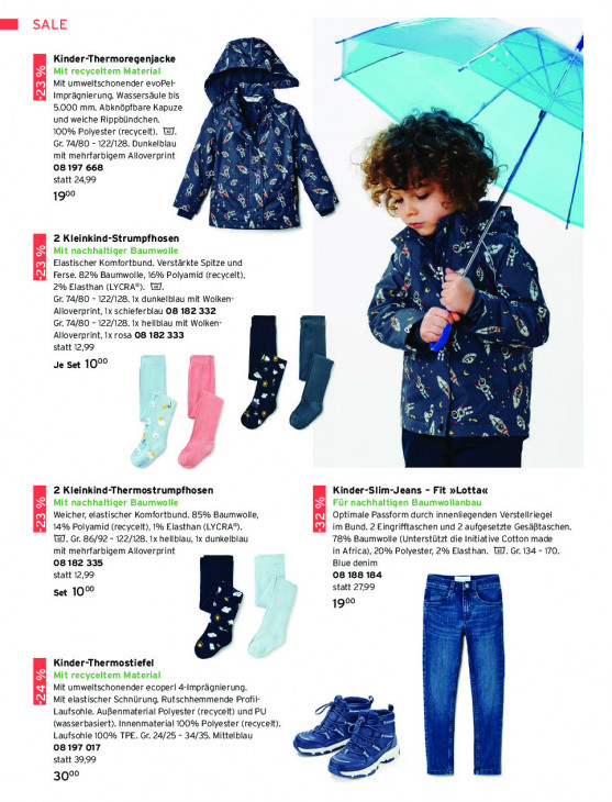 Bitte beachten Sie, dass dieser Text automatisch generiert wird und möglicherweise Fehler enthältSALE Kinder-Thermoregenjacke A Mit recyceltem Material Mit umweltschonender evoPel- e PEL Imprägnierung. Wassersäule bis 5.000 mm. Abknöpfbare Kapuze und weiche Rippbündchen. EA 100% Polyester (recycelt). WJ. PA Gr. 74/80 - 122/128. Dunkelblau Ki & ® & A mit mehrfarbigem Alloverprint E > à 08197 668 b À ii % statt 24,99 a 4 Ce 1900 à B a = js 2 Kleinkind-Strumpfhosen Mit nachhaltiger Baumwolle INH Elastischer Komfortbund. Verstärkte Spitze und L23 % Ferse. 82% Baumwolle, 16% Polyamid (recycelt), 2% Elasthan (LYCRA®). WI. Pol) Gr. 74/80 - 122/128. 1x dunkelblau mit Wolken- Alloverprint, 1x schieferblau 08 182 332 Gr. 74/80 - 122/128. 1x hellblau mit Wolken- ù Alloverprint, 1x rosa 08 182 333 hd € 8 statt 12,99 & Je set 10°0 u OX < A NS r 3) % ÿ Ps 4 | j } 2 Kleinkind-Thermostrumpfhosen Kinder-Slim-Jeans - Fit »Lotta« Mit nachhaltiger Baumwolle Für nachhaltigen Baumwollanbau Weicher, elastischer Komfortbund. 85% Baumwolle, Optimale Passform durch innenliegenden Verstellriegel 2x%7 14% Polyamid (recycelt), 1% Elasthan (LYCRA®). -32 % im Bund. 2 Eingrifftaschen und 2 aufgesetzte Gesäßtaschen. T1. Gr. 86/92 - 122/128. 1x hellblau, 1x dunkelblau 78% Baumwolle (Unterstützt die Initiative Cotton made mit mehrfarbigem Alloverprint in Africa), 20% Polyester, 2% Elasthan. WJ. Gr. 134 - 170. 08182 335 Blue denim statt 12,99 08188 184 Set 10° statt 2799 goo Kinder-Thermostiefel Mit recyceltem Material Mit umweltschonender ecoper! 4-Imprägnierung. L24 % Mit elastischer Schnürung. Rutschhemmende Profil- Laufsohle. AuBenmaterial Polyester (recycelt) und PU (wasserbasiert). Innenmaterial 100% Polyester (recycelt). Laufsohle 100% TPE. Gr. 24/25 - 34/35. Mittelblau 08197 017 statt 39,99 co