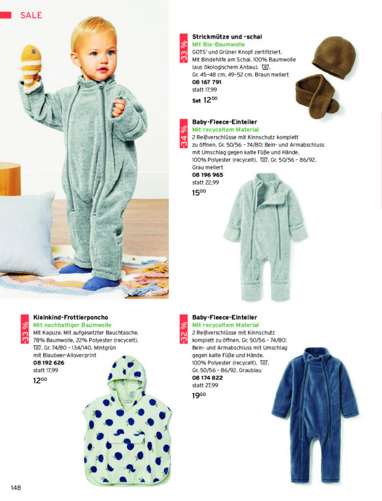 Bitte beachten Sie, dass dieser Text automatisch generiert wird und möglicherweise Fehler enthältM SALE ff Strickmütze und -schal Mit Bio-Baumwolle K GOTS! und Grüner Knopf zertifiziert. -33 % Mit Bindehilfe am Schal. 100% Baumwolle S (aus ökologischem Anbau). EI. Gr. 45-48 cm, 49-52 cm. Braun meliert 08 167 791 #7 > statt 17,99 si Set 12% f à N Baby-Fleece-Einteiler Mit recyceltem Material 2 Reißverschlüsse mit Kinnschutz komplett EZRA zu öffnen. Gr. 50/56 - 74/80: Bein- und Armabschluss mit Umschlag gegen kalte Füße und Hände. 100% Polyester (recycelt). WJ. Gr. 50/56 - 86/92. % Grau meliert 08 196 965 + statt 22,99 1500 Y | % N au Oms, ! E à JE Le i = ik Kleinkind-Frottierponcho Baby-Fleece-Einteiler Mit nachhaltiger Baumwolle Mit recyceitem Material Mit Kapuze. Mit aufgesetzter Bauchtasche. 2 Reißverschlüsse mit Kinnschutz EEE 78% Baumwolle, 22% Polyester (recycelt). -32 % komplett zu öffnen. Gr. 50/56 - 74/80: Wal. Gr. 74/80 -134/140. Mintgrün Bein- und Armabschluss mit Umschlag mit Blaubeer-Alloverprint gegen kalte Füße und Hände. 08192 626 100% Polyester (recycelt). WJ. statt 17,99 ‚oe Gr. 50/56 - 86/92. Graublau 1200 08 174822 statt 27,99 1900 .. „ev * ey te we 9 © ® + « 148 SAYS