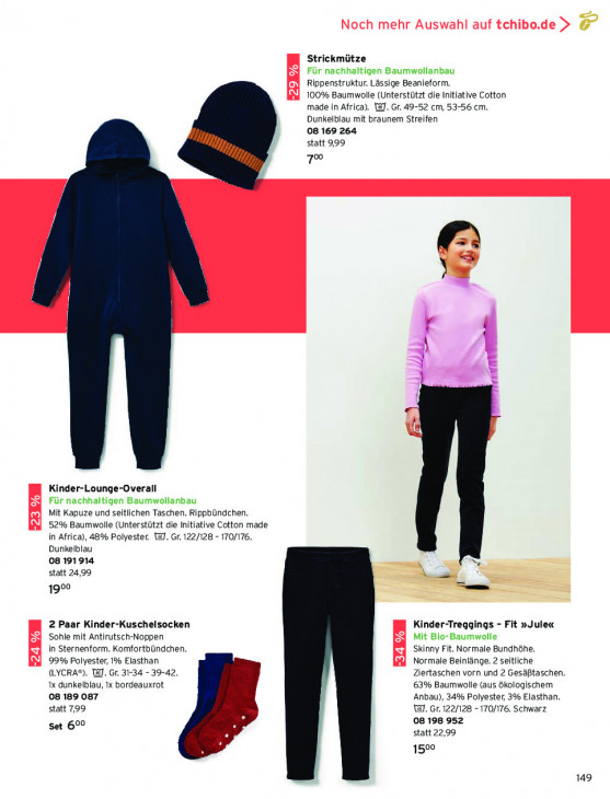 Bitte beachten Sie, dass dieser Text automatisch generiert wird und möglicherweise Fehler enthältStrickmütze Für nachhaltigen Baumwollanbau Rippenstruktur. Lässige Beanieform. 100% Baumwolle (Unterstützt die Initiative Cotton made in Africa). WJ. Gr. 49-52 cm, 53-56 cm. Dunkelblau mit braunem Streifen 08 169 264 statt 999 7eo €) Kinder-Lounge-Overall Für nachhaltigen Baumwollanbau Mit Kapuze und seitlichen Taschen. Rippbündchen. 52% Baumwolle (Unterstützt die Initiative Cotton made in Africa), 48% Polyester. Wal. Gr. 122/128 - 170/176. Dunkelblau 08 191914 statt 24,99 1900 2 Paar Kinder-Kuschelsocken Kinder-Treggings - Fit »Jule« Sohle mit Antirutsch-Noppen Mit Bio-Baumwolle in Sternenform. Komfortbündchen. Skinny Fit. Normale Bundhöhe. 99% Polyester, 1% Elasthan Normale Beinlänge. 2 seitliche (LYCRA®). WJ. Gr. 31-34 - 39-42. h Ziertaschen vorn und 2 Gesäßtaschen. 1x dunkelblau, 1x bordeauxrot 63% Baumwolle (aus ökologischem 08 189 087 = Anbau), 34% Polyester, 3% Elasthan. statt 799 tal. Gr. 122/128 - 170/176. Schwarz 08 198 952 set 600 D statt 22,99 pe 500 149