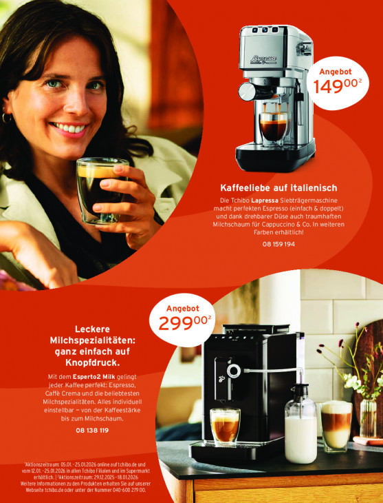 Bitte beachten Sie, dass dieser Text automatisch generiert wird und möglicherweise Fehler enthältÁ \ | Angebot 14999 LIE eu À = I Kaffeeliebe auf italienisch Die Tchibo Lapressa Siebträgermaschine macht perfekten Espresso (einfach & doppelt) und dank drehbarer Düse auch traumhaften Milchschaum für Cappuccino & Co. In weiteren Farben erhältlich! Œ- 08159194 Angebot Leckere 29900 M Milchspezialitäten: ganz einfach auf Knopfdruck. NA EAN ta ALD jeder Kaffee perfekt: Espresso, Caffè Crema und die beliebtesten né Milchspezialitäten. Alles individuell einstellbar — von der Kaffeestärke | À bis zum Milchschaum. | 08 138 19 N AU “ktionszeitraum: 05.01.-25.012026 online auftchibo.de und vom 2.01.-25.01.2026 in allen Tchibo Filialen und im Supermarkt erhältlich. |?Aktionszeitraum: 2912.2025 -18.012026 Weitere Informationen zu den Produkten erhalten Sie auf unserer = zee Webseite tchibo.de oder unter der Nummer 040-600 279 00, mn