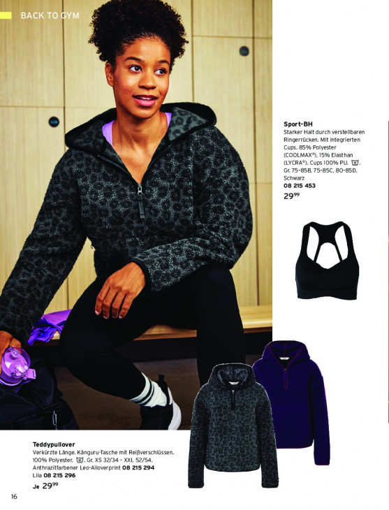 Bitte beachten Sie, dass dieser Text automatisch generiert wird und möglicherweise Fehler enthältER a) W — =) Sport-BH Starker Halt durch verstellbaren Ringerrücken. Mit integrierten Cups. 85% Polyester (COOLMAX®), 15% Elasthan (LYCRA®). Cups 100% PU. WJ. Gr. 75-858, 75-85C, 80-85D. Schwarz 08 215 453 29% “ A, NX LC Ji oo. =, pi ll Teddypullover Verkürzte Länge. Känguru-Tasche mit Reißverschlüssen. 100% Polyester. WJ. Gr. XS 32/34 - XXL 52/54. Anthrazitfarbener Leo-Alloverprint O8 215 294 Lila 08 215 296 Je 29% 16
