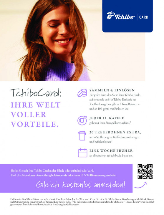 Bitte beachten Sie, dass dieser Text automatisch generiert wird und möglicherweise Fehler enthältTen | caro SAMMELN & EINLOSEN TchiboCard Für jeden Euro, den Sie in Ihrer Tchibo Filiale, auf tchibo.de und für Tchibo Einkäufe bei Kaufland ausgeben, gibt es 2 TreueBohnen - und ab 100 geht's mit Einlösen los, JEDER 11. KAFFEE gehtmit Ihrer Stempelkarte auf uns. 30 TREUEBOHNEN EXTRA wenn Sie Ihre eigene Kaffeedose mitbringen und befüllen lassen. EINE WOCHE FRÜHER als alleanderen auf tchibo.de bestellen. Elie er "Einlösbar in allen Tchibo Filialen und auf schibo.de. Eine TieueBohne hat den Wert von I Cent. Gilt nicht für Tchibo Fitness, Versicherungen, Mobilfunk, Blumen und Partnerangebote. Ein Anspruch auf Barauzahlung bestchtnicht. "Alle Informationen finden Sie unter schibode/tchibocard "Die aus diesem Vorteilzusätzlich gesammdten TreueBohnen zahlen nicht aufdie Erreichungdes Goldstatusein.