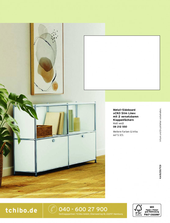 Bitte beachten Sie, dass dieser Text automatisch generiert wird und möglicherweise Fehler enthält0 u ne u À = Metall-Sideboard »CN3 Slim Line« mit 2 versetzbaren y Klappenfächern ‘ Matt weiB VA 08 212 550 Weitere Farben & Infos auf 5.123. À Irrtum und Druckfehler vorbehalten. | KAIS/2S/TCD == Br MIX tchibo.de 040 - 600 27 900 Walsnutzung er | Fordert Vertragspartner: Tchibo GmbH, Überseering18, 22297 Hamburg FSC weiss _FSC* 0022597