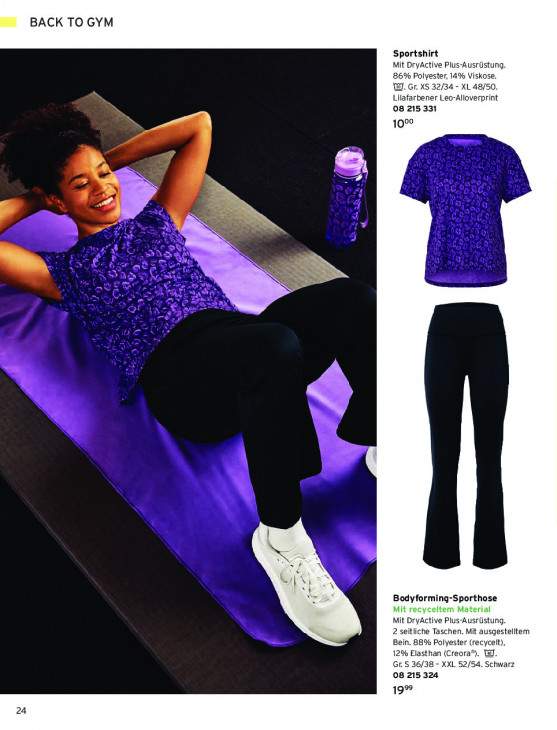 Bitte beachten Sie, dass dieser Text automatisch generiert wird und möglicherweise Fehler enthältBACK TO GYM Sportshirt Mit DryActive Plus-Ausrüstung. 6% Polyester, 14% Viskose. W. Gr. XS 32/34 - XL 48/50. Lilafarbener Leo-Alloverprint 08 215 331 100° SN ig N ve SE Wy Bodyforming-Sporthose Mit DryActive Plus-Ausrüstung. 2 seitliche Taschen. Mit ausgestelltem Bein. 88% Polyester (recycelt), 12% Elasthan (Creora® Gr. S 36/38 - XXL 52/54. hwarz 08 215 324 19% 24