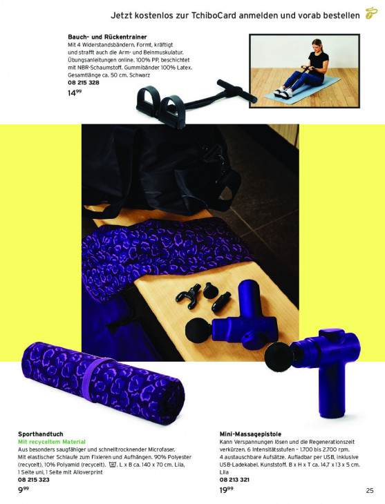 Bitte beachten Sie, dass dieser Text automatisch generiert wird und möglicherweise Fehler enthältJetzt kostenlos zur TchiboCard anmelden und vorab bestellen Bauch- und Rückentrainer Mit 4 Widerstandsbändern. Formt, kräftigt und strafft auch die Arm- und Beinmuskulatur. Übungsanleitungen online. 100% PP, beschichtet mit NBR-Schaumstoff. Gummibänder 100% Latex. Gesamtlänge ca. 50 cm. Schwarz 08 215 328 14% A 77 En 5, hak \ AR à JEN = „er A > w ú DS Ct Sporthandtuch Mini-Massagepistole Mit recyceltem Material Kann Verspannungen lösen und die Regenerationszeit ‚Aus besonders saugfähiger und schnelltrocknender Microfaser. verkürzen. 6 Intensitätsstufen - 1.700 bis 2700 rpm. Mit elastischer Schlaufe zum Fixieren und Aufhängen. 90% Polyester 4 austauschbare Aufsätze. Aufladbar per USB, inklusive (recycelt), 10% Polyamid (recycelt). W.L x B ca. 140 x 70 cm. Lila, USB-Ladekabel. Kunststoff. Bx Hx T ca. 14,7 x13x 5 cm. 1 Seite uni, 1 Seite mit Alloverprint Lila 08 215 323 08 213 321 9% 1999 25