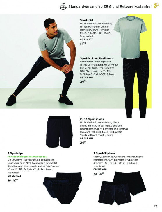 Bitte beachten Sie, dass dieser Text automatisch generiert wird und möglicherweise Fehler enthältStandardversand ab 29€ und Retoure kostenfrei F Sportshirt Mit DryActive Plus-Ausrüstung. Mit reflektierenden Design- elementen. 100% Polyester. TJ. Gr S 44/46 - XXL 60/62. Grau meliert tE 08 214107 14% & Sporttight »ActivePower« Powerzonen für eine gezielte, leichte Unterstützung. Mit DryActive Plus-Ausrüstung. 72% Polyester, 28% Elasthan (Creora®). 129. Gr. S 44/46 - XXL 60/62. Schwarz 08 213 601 39% 2-in-1-Sportshorts Mit DryActive Plus-Ausrüstung. Web- Shorts mit integrierter Tight. 2 seitliche Eingrifftaschen. 88% Polyester, 12% Elasthan (Creora®). WI. Gr. S 44/46 - XXL 60/62. Shorts anthrazit. Tight schwarz 08 213656 24” 3 Sportslips 2 Sport-Slipboxer Für nachhaltigen Baumwollanbau Mit DryActive Plus-Ausrüstung. Weicher, flacher Mit DryActive Plus-Ausrüstung. Extraflacher, Komfortbund. 92% Polyester, 8% Elasthan elastischer Bund. 95% Baumwolle (Unterstützt (Creora®). TAI. Gr. S/4 - XXL/8. 1x schwarz, die Initiative Cotton made in Africa), 5% Elasthan ix anthrazit (Creora®). WI. Gr. S/4- XXL/B. 2x schwarz, 08 213 658 1x anthrazit set 14% 08 213 603 set 12% 27