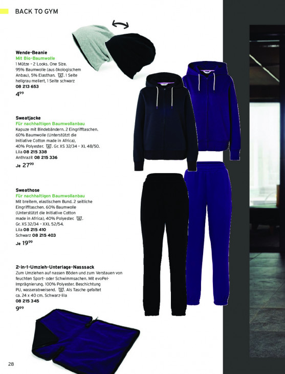 Bitte beachten Sie, dass dieser Text automatisch generiert wird und möglicherweise Fehler enthältBACK TO GYM Wende-Beanie 1 Mütze - 2 Looks. One Size. 95% Baumwolle (aus ökologischem Anbau), 5% Elasthan. 18]. 1 Seite hellgrau meliert, 1 Seite schwarz 08 213 653 499 Sweatjacke Kapuze mit Bindebändern. 2 Eingrifftaschen. 60% Baumwolle (Unterstützt die Initiative Cotton made in Africa), 40% Polyester. Wil. Gr. XS 32/34 - XL 48/50. Lila 08 215 338 Anthrazit 08 215 336 m Je 27° Sweathose Mit breitem, elastischem Bund. 2 seitliche Eingrifftaschen. 60% Baumwolle (Unterstützt die Initiative Cotton made in Africa), 40% Polyester. Ti]. Gr. XS 32/34 - XXL 52/54. Lila 08 215 410 Schwarz 08 215 403 Je 19% Be 4 ee dl 2-in-1-Umzieh-Unterlage-Nasssack NE = Zum Umziehen auf nassen Böden und zum Verstauen von feuchten Sport- oder Schwimmsachen. Mit evoPel- Imprägnierung. 100% Polyester. Beschichtung PU, wasserabweisend. WJ. Als Tasche gefaltet ca. 24 x 40 cm. Schwarz-lila 08 215 345 999 28