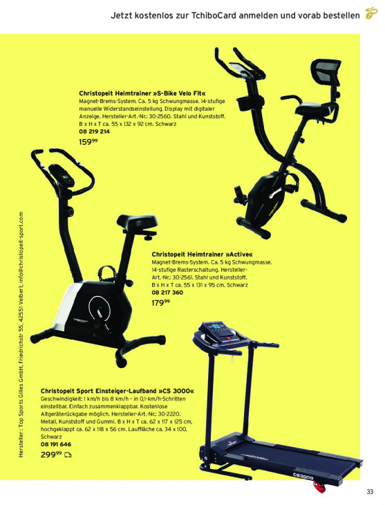 Bitte beachten Sie, dass dieser Text automatisch generiert wird und möglicherweise Fehler enthältChristopeit Heimtrainer »S-Bike Velo Fit« Magnet-Brems-System. Ca. 5 kg Schwungmasse. 14-stufige manuelle Widerstandseinstellung. Display mit digitaler Anzeige. Hersteller-Art ‚Nr. 30-2560. Stahl und Kunststoff. BXHXT ca. 55 x 132 x 92 cm. Schwarz 08 219 214 159%. Christopeit Heimtrainer »Active« Magnet-Brems-System. Ca. 5 kg Schwungmasse. 14-stufige Rasterschaltung. Hersteller- Art. : 30-2561. Stahl und Kunststoff. Bx HxT ca. 55 x 131 x 95 cm. Schwarz 08 217 360 179% Christopeit Sport Einsteiger-Laufband »CS 3000« Geschwindigkeit: | km/h bis 8 km/h - in O,-km/h-Schritten einstellbar. Einfach zusammenklappbar. Kostenlose Altgeräterückgabe möglich. Hersteller-Art.-Nr: 30-2220. Metall, Kunststoff und Gummi. Bx Hx T ca. 62 x 17 x 125 cm, hochgeklappt ca. 62 x 118 x 56 cm. Lauffläche ca. 34 x 100. Schwarz 08 191646 Hersteller : Top Sports Gilles GmbH, Friedrichstr 55, 42551 Velbert, [email protected] 2992 5