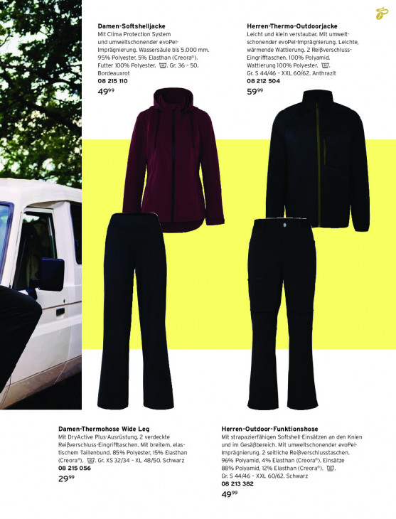 Bitte beachten Sie, dass dieser Text automatisch generiert wird und möglicherweise Fehler enthält5 er Les Damen-Softshelljacke Herren-Thermo-Outdoorjacke & a Mit Clima Protection System Leicht und klein verstaubar. Mit umwelt- und umweltschonender evoPel- schonender evoPel-Imprägnierung. Leichte, Imprägnierung. Wassersäule bis 5.000 mm. wärmende Wattierung. 2 ReiBverschluss- 95% Polyester, 5% Elasthan (Creora®). Eingrifftaschen. 100% Polyamid. Ste LT 4 Futter 100% Polyester. WJ. Gr. 36 - 50. Wattierung 100% Polyester. @. Bordeauxrot Gr. S 44/46 - XXL 60/62. Anthrazit LE. 08 215 10 08 212 504 Rs ? ges 59° É 5 ie D Ban. ad UN: 2 25 D ci 5 F LA LE Ka Cu Damen-Thermohose Wide Leg Herren-Outdoor-Funktionshose Mit DryActive Plus-Ausrüstung. 2 verdeckte Mit strapazierfähigen Softshell-Einsätzen an den Knien Reißverschluss-Eingrifftaschen. Mit breitem, elas- und im Gesäßbereich. Mit umweltschonender evoPel- tischem Taillenbund. 85% Polyester, 15% Elasthan Imprägnierung. 2 seitliche Reißverschlusstaschen. (Creora®). WJ. Gr. XS 32/34 - XL 48/50. Schwarz 96% Polyamid, 4% Elasthan (Creora®). Einsätze 08 215 056 88% Polyamid, 12% Elasthan (Creora®). 129. 29° Gr. S 44/46 - XXL 60/62. Schwarz 08 213 382 49°