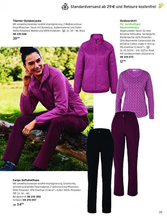 Bitte beachten Sie, dass dieser Text automatisch generiert wird und möglicherweise Fehler enthält& Standardversand ab 29€ und Retoure kostenfrei Thermo-Outdoorjacke Outdoorshirt Mit umweltschonender evoPel-Imprägnierung. 2 ReiBverschluss- Für nachhaltigen Eingrifftaschen. Saum mit Kordelzug. Außenmaterial und Futter Baumwollanbau 100% Polyamid. Wattierung 100% Polyester. Ll. Gr. 34 - 46. Rosa Abgerundeter Saum für eine 08 215 066 feminine Silhouette. Verlängerte Rückenpartie. 62% Polyester, 99 33% Baumwolle (Unterstützt die 4 Initiative Cotton made in Africa), À = an 5% Elasthan (Creora®). @J. h Gr. XS 32/34 - XXL 52/54. Rosé El mit bordeauxrotem Alloverprint 2 08 215 073 12% es | À at. vk % = | SG 7 | © N Re: à y à € a a ld 4 Le 2 } D x ee es À Ë ESSEN R à be >. WERDEN & 3 ar Br DIE, di en 5 > es X Cargo-Softshellhose Mit umweltschonender evoPel-Imprägnierung. Elastisches, schnelltrocknendes Obermaterial. 2 seitliche Eingrifftaschen. 90% Polyester, 10% Elasthan (Creora®). Futter 100% Polyester. WI. Gr. 36 -48. Bordeauxrot 08 215 055 Schwarz 08 215 057 Je 349° 39