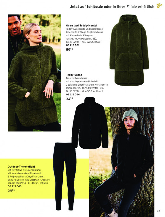 Bitte beachten Sie, dass dieser Text automatisch generiert wird und möglicherweise Fehler enthältJetzt auf tchibo.de oder in Ihrer Filiale erhältlich 7 js VE FEN > Oversized Teddy-Mantel 27 a Teddy-AuBenseite und Microfleece- mc Innenseite. 2-Wege-Reißverschluss mit Kinnschutz. Känguru- Tasche. 100% Polyester. 137. tr Gr. XS 32/34 - XXL 52/54. Khaki 08 215 081 5999 Teddy-Jacke Frontreißverschluss mit durchgehendem Untertritt. 2 seitliche Eingrifftaschen. Verlängerte Rückenpartie. 100% Polyester. @J. Gr. XS 32/34 - XL 48/50. Anthrazit 08 215 054 499 AA ( N N ] N { | Á Outdoor-Thermotight Mit DryActive Plus-Ausrüstung. | Mit innenliegendem Bindeband. Al 2 ReiBverschluss-Eingrifftaschen. UM 85% Polyester, 15% Elasthan (Creora®). [au W. Gr. XS 32/34 - XL 48/50. Schwarz à d 08 215 065 29° es IN 43 5