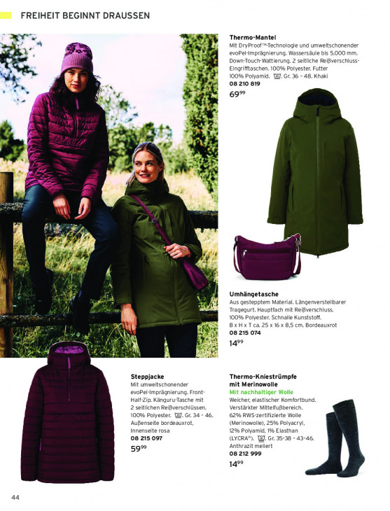 Bitte beachten Sie, dass dieser Text automatisch generiert wird und möglicherweise Fehler enthältFREIHEIT BEGINNT DRAUSSEN ar NE Thermo-Mantel 4 A Mit DryProof "Technologie und umweltschonender Es 4 xr A evoPel-Imprägnierung. Wassersäule bis 5.000 mm. Down-Touch-Wattierung. 2 seitliche Reißverschluss- N UN Eingrifftaschen. 100% Polyester. Futter 100% Polyamid. WJ. Gr. 36 - 48. Khaki En 08 210 819 N wi \ ; Sn 69° & Me É AA he. 4 NA ma Fu DA j En 1970 LD * en x 7 Le = 5 7 en * - BF A == ; = ea j GC DE ie ds - EA LL 4 4 N Umhängetasche N Aus gestepptem Material. Längenverstellbarer br Tragegurt. Hauptfach mit Reißverschluss. 100% Polyester. Schnalle Kunststoff. Pi BXHXT ca. 25 x 16 x 8,5 cm. Bordeauxrot vh NN 08 215 074 d, pn x! 149 ad À Ré Ei } EN hd | Steppjacke Thermo-Kniestrümpfe Mit umweltschonender mit Merinowolle evoPel-mprägnierung. Front- Mit nachhaltiger Wolle Half-Zip. Känguru-Tasche mit Weicher, elastischer Komfortbund. 2 seitlichen Reißverschlüssen. Verstärkter Mittelfußbereich. 100% Polyester. I]. Gr. 34 - 46. 62% RWS-zertifizierte Wolle ‚Außenseite bordeauxrot, (Merinowolle), 25% Polyacryl, Innenseite rosa 12% Polyamid, 1% Elasthan 08 215 097 (LYCRA). Gr. 35-38 - 43-46, Anthrazit meliert 59% 08 212 999 14% 44