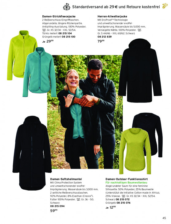 Bitte beachten Sie, dass dieser Text automatisch generiert wird und möglicherweise Fehler enthältStandardversand ab 29€ und Retoure kostenfrei Damen-Strickfleecejacke Herren-Allwetterjacke 2 Reißverschluss-Eingrifftaschen. Mit DryProof*-Technologie Abgerundete, längere Rückenpartie. und umweltschonender evoPel- Antipilling-Ausrüstung. 100% Polyester. Imprägnierung. Wassersäule bis 5.000 mm. I. Gr. XS 32/34 - XXL 52/54. Versiegelte Nähte. 100% Polyester. 1. Türkis meliert 08 215 104 Gr. S 44/46 - XXL 60/62. Schwarz Grüngelb meliert 08 215 100 08 212 839 Je 29% 79% et f x + Ms N We Là ann M te den eh EN ele | EN {| ré D | g N ii / R + Ben, m IN N a L \ \ + JX (5 d HA E 7 X Gi»; Se en 2 RR vr WE I Ami + Te, Pa \ ce VAL 2 ze > ES 7a 4 1 Fan: Damen-Softshellmantel Damen-Outdoor-Funktionsshirt Mit Clima Protection System und umweltschonender evoPel- Abgerundeter Saum für eine feminine Imprägnierung. Wassersäule bis 3.000 mm. Silhouette. 50% Polyester, 25% Baumwolle 2 seitliche Reifverschlusstaschen. (Unterstützt die Initiative Cotton made in Africa), 92% Polyester, 8% Elasthan (Creora®). 25% Viskose. WJ. Gr. XS 32/34 - XXL 52/54. Futter 100% Polyester. 1. Gr. 36 - 50. Schwarz 08 215 072 Schwarz Grüngelb 08 215 076 08 215 094 Je 12% 599 45