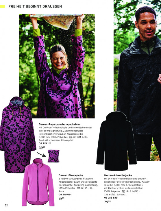 Bitte beachten Sie, dass dieser Text automatisch generiert wird und möglicherweise Fehler enthältan FREIHEIT BEGINNT DRAUSSEN A mu en Er Br SA >@ Pr 2 a a BD N 5 % n Ps .f De % LA y (| Ei í x 2 î A | Be PR Le" a à | 2 d 7% 2 Li 7 1 à ea N N + € N (2: pa? Damen-Regenponcho »packable« [M Mit DryProof"-Technologie und umweltschonender evoPel-Imprägnierung. Zusammengefaltet in Fronttasche verstaubar. Wassersäule bis 5.000 mm. 100% Polyester. LA. Gr. S/M, L/XL. w Rosé mit schwarzem Alloverprint 08 215 12 39° — £ | Ä Damen-Fleecejacke Herren-Allwetterjacke 2 Reißverschluss-Eingrifftaschen. Mit DryProof*-Technologie und umwelt- ‚Abgerundeter Saum und verlängerte schonender evoPel-Imprägnierung. Wasser- säule bis 5.000 mm. Ärmelabschluss Rückenpartie. Antipilling-Ausrüstung, 100% Polyester. 1]. Gr. XS- XL. mit Klettverschluss weitenverstellbar. 1l Rosa 100% Polyester. WJ. Gr. S 44/46 - we 08 215 091 XXL 60/62. Schwarz 08 212 839 | 19% 79%. 52