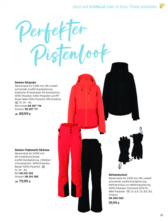 Bitte beachten Sie, dass dieser Text automatisch generiert wird und möglicherweise Fehler enthältJetzt auf tchibo.at oder in Ihrer Filiale bestellen F if 1 | ll Damen-Skijacke Wassersäule bis 3.000 mm. Mit umwelt- schonender evoPel-Imprägnierung. Elastische Ärmelstulpen mit Daumenloch, 100% Polyester. Futter Polyester und PP. Power-Mesh 90% Polyamid, 10% Elasthan. W. Gr. 34-46, Rot-orange 08 207 716 Schwarz 08 207 711 Je 89,99€ Damen-Highwaist-Skihose Wassersäule bis 5.000 mm. Mit umweltschonender evoPel-Imprägnierung. 2 Reißver- schlusstaschen. 100% Polyester. Besatz 100% Polyamid. 13. Gr. 34 - 46. Rot 08 210 393 Schwarz 08 210 392 Skihandschuh Wassersäule bis 3.000 mm. Mit umwelt- Je 79,99 € schonender evoPel-Imprägnierung. Klettverschluss zur Weitenregulierung. 100% Polyester. Innenhand 52% PU, 48% Polyester. WI. Gr. 6,5, 7,5, 8,5, 95. Schwarz 08 208 065 19,99€ 61