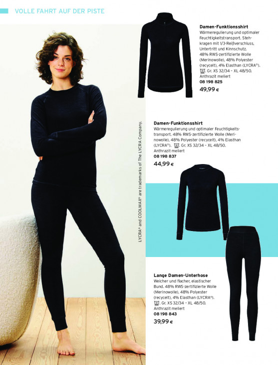 Bitte beachten Sie, dass dieser Text automatisch generiert wird und möglicherweise Fehler enthältDamen-Funktionsshirt Wärmeregulierung und optimaler D Feuchtigkeitstransport. Steh- kragen mit 1/3-Reißverschluss, Untertritt und Kinnschutz, 48% RWS-zertifizierte Wolle (Merinowolle), 48% Polyester (recycelt), 4% Elasthan (LYCRA®). W. Gr. XS 32/34 - XL 48/50. Anthrazit meliert 08 198 825 49,99€ Damen-Funktionsshirt Wärmeregulierung und optimaler Feuchtigkeits- transport. 48% RWS-zertifizierte Wolle (Meri- nowolle), 48% Polyester (recycelt), 4% Elasthan (LYCRA®). W. Gr. XS 32/34 - XL 48/50. Anthrazit meliert 08198 837 44,99€ & Fe LYCRA® and COOLMAX® are trademarks of The LYCRA Company. a Es Lange Damen-Unterhose Weicher und flacher, elastischer Bund. 48% RWS-zertifizierte Wolle (Merinowolle), 48% Polyester (recycelt), 4% Elasthan (LYCRA®). W. Gr. XS 32/34 - XL 48/50. Anthrazit meliert 08198 843 39,99€ Ds 7 ee | \