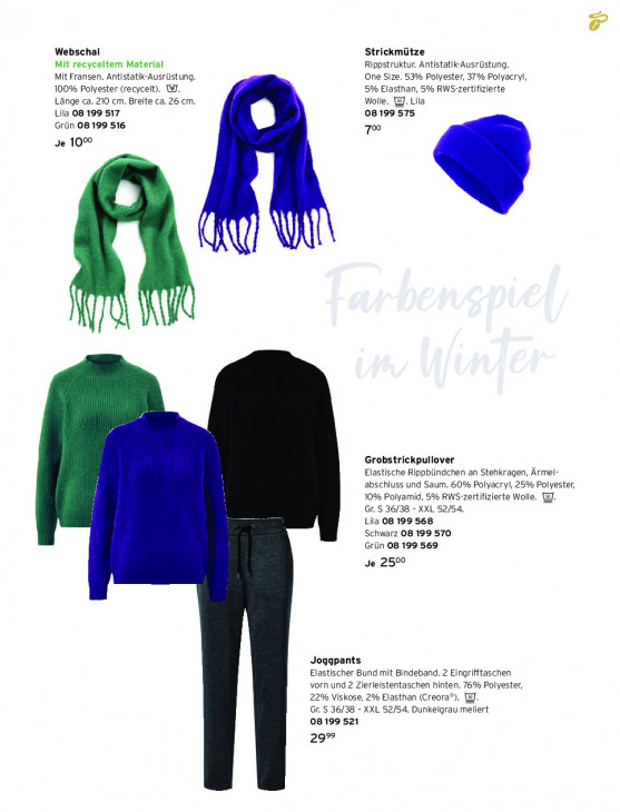 Bitte beachten Sie, dass dieser Text automatisch generiert wird und möglicherweise Fehler enthältWebschal Strickmütze Mit recyceltem Material Rippstruktur. Antistatik-Ausrüstung. Mit Fransen. Antistatik-Ausrüstung. One Size. 53% Polyester, 37% Polyacryl, 100% Polyester (recycelt). WI. 5% Elasthan, 5% RWS-zertifizierte Länge ca. 210 cm. Breite ca. 26 cm, Wolle. WJ. Lila Lila 08 199 517 08199 575 Grün 08 199 516 70 Je 1000 Grobstrickpullover Elastische Rippbündchen an Stehkragen, Ârmel- abschluss und Saum. 60% Polyacryl, 25% Polyester, 10% Polyamid, 5% RWS-zertifizierte Wolle. Gr. S 36/38 - XXL 52/54. Lila 08 199 568 Schwarz 08 199 570 Grün 08 199 569 Je 2500 Joggpants Elastischer Bund mit Bindeband. 2 Eingrifftaschen vorn und 2 Zierleistentaschen hinten. 76% Polyester, 22% Viskose, 2% Elasthan (Creora®). Gr. S 36/38 - XXL 52/54, Dunkelgrau meliert 08199 521 29°
