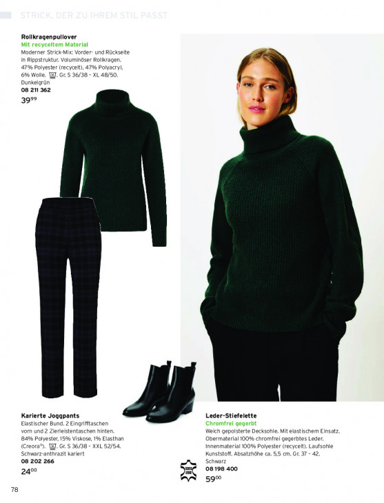 Bitte beachten Sie, dass dieser Text automatisch generiert wird und möglicherweise Fehler enthältRollkragenpullover Mit recyceltem Material Moderner Strick-Mix: Vorder- und Rückseite in Rippstruktur. Voluminöser Rollkragen. 47% Polyester (recycelt), 47% Polyacryl, 6% Wolle. W. Gr. S 36/38 - XL 48/50. Dunkelgrün 08 211 362 ge 39°° 3 Karierte Joggpants Leder-Stiefelette Elastischer Bund. 2 Eingrifftaschen Chromfrei gegerbt vorn und 2 Zierleistentaschen hinten. Weich gepolsterte Decksohle. Mit elastischem Einsatz. 84% Polyester, 15% Viskose, 1% Elasthan Obermaterial 100% chromfrei gegerbtes Leder. (Creora®). W. Gr. S 36/38 - XXL 52/54, Innenmaterial 100% Polyester (recycelt). Laufsohle Schwarz-anthrazit kariert Kunststoff. Absatzhöhe ca. 5,5 cm. Gr. 37 - 42. 08 202 266 Schwarz 08198 400 400 5900 78