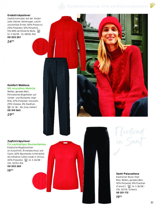 Bitte beachten Sie, dass dieser Text automatisch generiert wird und möglicherweise Fehler enthältGrobstrickpullover Zopfstrickmuster auf der Vorder- seite. Kleiner Stehkragen. Leicht voluminöse Ärmel. 60% Polyacryl, 25% Polyester, 10% Polyamid, 5% RWS-zertifizierte Wolle. =S Gr. S 36/38 - XL 48/50. Rot 08 202 267 nl 2400 & d. | u || 4 NZ 5 À \ } 4 Komfort-Webhose Mit recyceltem Material Weites, gerades Bein. u Permanente Bügelfalten auf if Vorder- und Rückseite. High Rise. 67% Polyester (recycelt), 29% Viskose, 4% Elasthan. W. Gr. 36 - 46, Grau meliert 08 199 560 2900 N ee Zopfstrickpullover Für nachhaltigen Baumwollanbau Elastische Rippbündchen an Ausschnitt, Ärmelabschluss und Saum. 60% Baumwolle (Unterstützt die Initiative Cotton made in Africa), n 40% Polyester. TE]. Gr. S 36/38 - XXL 52/54. Rot 08 202 260 1900 Samt-Palazzohose Elastischer Bund. High Rise. Weites, gerades Bein. 92% Polyester, 8% Elasthan (Creora®). W. Gr. 5 36/38 - XXL 52/54. Schwarz 08 201 172 goo 81