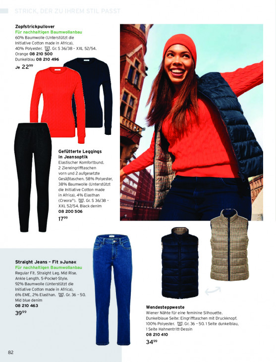 Bitte beachten Sie, dass dieser Text automatisch generiert wird und möglicherweise Fehler enthältZopfstrickpullover Fi nachhaltigen Baumwollanbau ar 60% Baumwolle (Unterstützt die Initiative Cotton made in Africa), 40% Polyester. WJ. Gr. S 36/38 - XXL 52/54. Orange 08 210 500 Dunkelblau 08 210 496 Je 22% ‘ à A A f N 4 à) N / "A ii À Gefütterte Leggings : in Jeansoptik 4 Elastischer Komfortbund. à De 2 Ziereingrifftaschen > vorn und 2 aufgesetzte és Gesäftaschen. 58% Polyester, 38% Baumwolle (Unterstützt B IR die Initiative Cotton made in Africa), 4% Elasthan (Creora®). 18]. Gr. $ 36/38 - ine XXL 52/54. Black denim 08 200 506 re 17° + in Ei EN 1 : LL I = De En En = Straight Jeans - Fit »Juna« De Für nachhaltigen Baumwollanbau Sif A Regular Fit. Straight Leg. Mid Rise. | | me Ankle Length. 5-Pocket-Style. 92% Baumwolle (Unterstützt die Initiative Cotton made in Africa), 6% EME, 2% Elasthan. WJ. Gr. 36 - 50. Mid blue denim 08 210 463 Wendesteppweste 99° Wiener Nähte für eine feminine Silhouette. Dunkelblaue Seite: Eingrifftaschen mit Druckknopf. 100% Polyester. WJ. Gr. 36 - 50.1 Seite dunkelblau, 1 Seite Hahnentritt-Dessin 08 210 410 34® 82