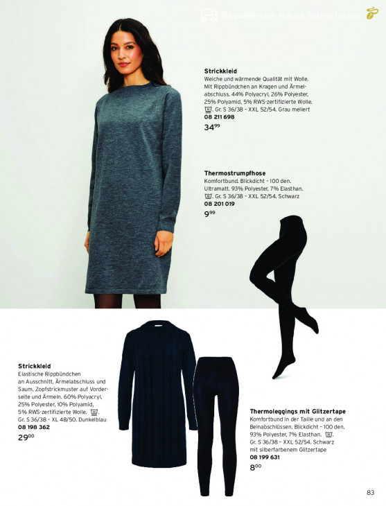 Bitte beachten Sie, dass dieser Text automatisch generiert wird und möglicherweise Fehler enthältStrickkleid Weiche und wärmende Qualität mit Wolle. Mit Rippbündchen an Kragen und Ärmel- abschluss. 44% Polyacryl, 26% Polyester, 25% Polyamid, 5% RWS-zertifizierte Wolle. W. cr. S 36/38 - XXL 52/54. Grau meliert 08 211 698 34% Thermostrumpfhose Komfortbund. Blickdicht -100 den. Ultramatt. 93% Polyester, 7% Elasthan. W. Gr. S 36/38 - XXL 52/54. Schwarz 08 201019 9° Strickkleid Elastische Rippbündchen an Ausschnitt, Ärmelabschluss und Saum. Zopfstrickmuster auf Vorder- seite und Ärmeln. 60% Polyacryl, 25% Polyester, 10% Polyamid, 5% RWS-zertifizierte Wolle. WI. Thermoleggings mit Glitzertape Gr. S 36/38 - XL 48/50. Dunkelblau Komfortbund in der Taille und an den 08 198 362 Beinabschlüssen. Blickdicht - 100 den. 93% Polyester, 7% Elasthan. WJ. goo Gr. S 36/38 - XXL 52/54. Schwarz mit silberfarbenem Glitzertape 08 199 631 gee 83