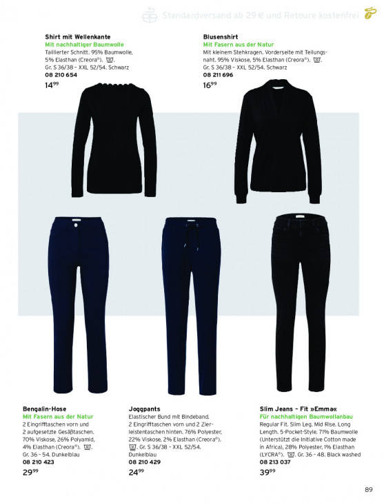 Bitte beachten Sie, dass dieser Text automatisch generiert wird und möglicherweise Fehler enthältShirt mit Wellenkante Blusenshirt Mit nachhaltiger Baumwolle Mit Fasern aus der Natur Taillierter Schnitt. 95% Baumwolle, Mit kleinem Stehkragen. Vorderseite mit Teilungs- 5% Elasthan (Creora®). @. naht. 95% Viskose, 5% Elasthan (Creora®). @. Gr. 5 36/38 - XXL 52/54. Schwarz Gr. S 36/38 - XXL 52/54. Schwarz 08 210654 08 211696 M N Bengalin-Hose Joggpants Slim Jeans - Fit »Emma« Mit Fasern aus der Natur Elastischer Bund mit Bindeband. Für nachhaltigen Baumwollanbau 2 Eingrifftaschen vorn und 2 Eingrifftaschen vorn und 2 Zier- Regular Fit. Slim Leg. Mid Rise. Long 2 aufgesetzte Gesäßtaschen. leistentaschen hinten. 76% Polyester, Length. 5-Pocket-Style. 71% Baumwolle 70% Viskose, 26% Polyamid, 22% Viskose, 2% Elasthan (Creora®) (Unterstützt die Initiative Cotton made 4% Elasthan (Creora®). @. W. or. S 36/38 - XXL 52/54. in Africa), 28% Polyester, 1% Elasthan Gr. 36 - 54. Dunkelblau Dunkelblau (LYCRA). WI. Gr. 36 - 48. Black washed 08 210 423 08 210 429 08 213 037 29% 24” 39% 89