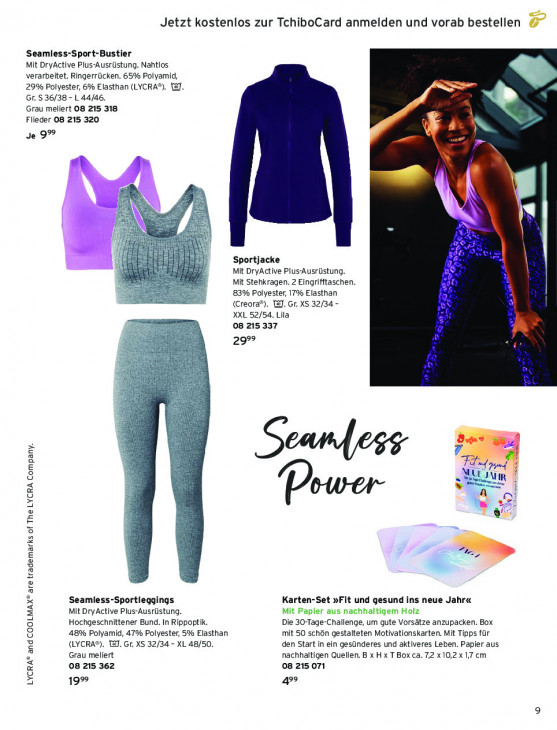 Bitte beachten Sie, dass dieser Text automatisch generiert wird und möglicherweise Fehler enthältJetzt kostenlos zur TchiboCard anmelden und vorab bestellen F Seamless-Sport-Bustier Mit DryActive Plus-Ausrüstung. Nahtlos verarbeitet. Ringerrücken. 65% Polyamid, 29% Polyester, 6% Elasthan (LYCRA®). WJ. Gr. S 36/38 - L 44/46. Van Grau meliert 08 215 318 Flieder 08 215 320 k N ee Je 9° ma | [HE Hk te N & >. = Sel Sportjacke À Mit DryActive Plus-Ausrüstung. àl Mit Stehkragen. 2 Eingrifftaschen. 83% Polyester, 17% Elasthan N a (Creora*). LA]. Gr. XS 32/34 - k XXL 52/54. Lila ee AR 08 215 337 4 ae 99 N N He a ee er hi . re à je il Seanfess Pd ag con! M Hd à LAK Fe Pewer > ; LE > Seamless-Sportleggings Karten-Set »Fit und gesund ins neue Jahr« Mit DryActive Plus-Ausrüstung. Mit Papier aus nachhaltigem Holz Hochgeschnittener Bund. In Rippoptik. Die 30-Tage-Challenge, um gute Vorsätze anzupacken. Box 48% Polyamid, 47% Polyester, 5% Elasthan mit 50 schön gestalteten Motivationskarten. Mit Tipps für (LYCRA®). WI. Gr. XS 32/34 - XL 48/50. den Start in ein gesünderes und aktiveres Leben. Papier aus Grau meliert nachhaltigen Quellen. B x H x T Box ca. 7,2 x10,2 x 1,7 cm 08 215 362 08 215 071 LYCRA® and COOLMAX® are trademarks of The LYCRA Company. 199 499
