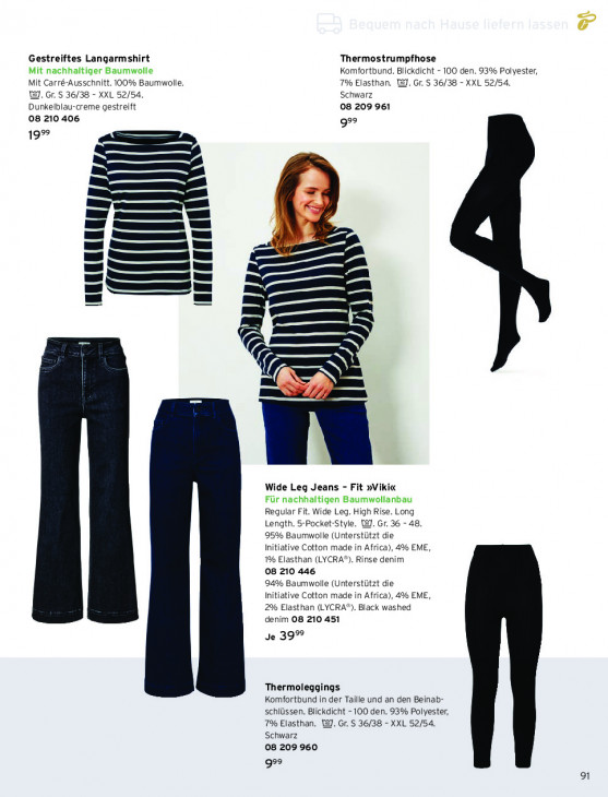 Bitte beachten Sie, dass dieser Text automatisch generiert wird und möglicherweise Fehler enthältGestreiftes Langarmshirt Thermostrumpfhose Mit nachhaltiger Baumwolle Komfortbund. Blickdicht - 100 den. 93% Polyester, Mit Carré-Ausschnitt. 100% Baumwolle. 7% Elasthan. @. Gr. S 36/38 - XXL 52/54. WJ. Gr. S 36/38 - XXL 52/54. Schwarz Dunkelblau-creme gestreift 08 209 961 08 210 406 99 19% En en x = 5 N m gr (N eN Wide Leg Jeans - Fit »Viki« Für nachhaltigen Baumwollanbau Regular Fit. Wide Leg. High Rise. Long Length. 5-Pocket-Style. WI. Gr. 36 - 48. 95% Baumwolle (Unterstützt die Initiative Cotton made in Africa), 4% EME, 1% Elasthan (LYCRA®). Rinse denim 08 210 446 94% Baumwolle (Unterstützt die Initiative Cotton made in Africa), 4% EME, 2% Elasthan (LYCRA®). Black washed denim 08 210 451 Je 39% Thermoleggings Komfortbund in der Taille und an den Beinab- schlüssen. Blickdicht -100 den. 93% Polyester, 7% Elasthan. @. Gr. S 36/38 - XXL 52/54. Schwarz 08 209 960 99 91