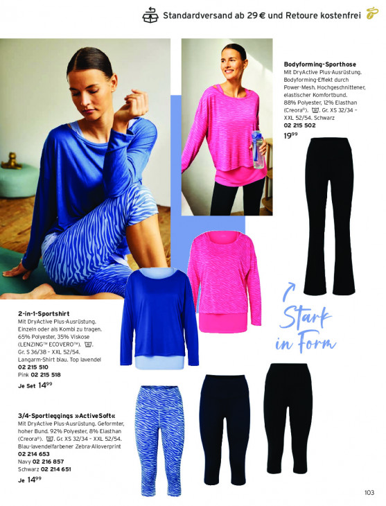 Bitte beachten Sie, dass dieser Text automatisch generiert wird und möglicherweise Fehler enthältStandardversand ab 29€ und Retoure kostenfrei F Bodyforming-Sporthose Mit DryActive Plus-Ausrüstung. Bodyforming-Effekt durch Power-Mesh. Hochgeschnittener, elastischer Komfortbund. 88% Polyester, 12% Elasthan x (Creora®). @. Gr. XS 32/34 - XXL 52/54. Schwarz 02 215 502 + 999 mv N ; Pr = | ) 4 | Pa CM AE >. mt > æ be in TZ 2-in -Sportshirt Mit DryActive Plus-Ausrüstung. Einzeln oder als Kombi zu tragen. 65% Polyester, 35% Viskose (LENZING” ECOVERO"). [8]. Gr. 5 36/38 - XXL 52/54. Langarm-Shirt blau. Top lavendel 02215 510 Pink 02 215 518 Je Set 149° RI Is 3/4-Sportleggings nActiveSoft« Mit DryActive Plus-Ausrüstung. Geformter, hoher Bund. 92% Polyester, 8% Elasthan (Creora®). 18]. Gr. XS 32/34 - XXL 52/54. Blau-lavendelfarbener Zebra-Alloverprint 02 214 653 Navy 02 216 857 Schwarz 02 214 651 à Sl x Je 149° nn 5 103