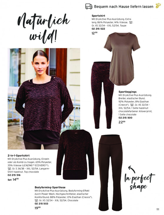 Bitte beachten Sie, dass dieser Text automatisch generiert wird und möglicherweise Fehler enthältEB Bequem nach Hause liefern lassen Sportshirt Mit DryActive Plus-Ausrüstung. Extra lang. 86% Polyester, 14% Viskose. WJ. Gr. XS 32/34 - XXL 52/54. Taupe (lech o2 215 522 12° wild FH m.‘ u Sportleggings Mit DryActive Plus-Ausrüstung. Breiter, elastischer Bund. 7 92% Polyester, 8% Elasthan (Creora®). @. Gr. XS 32/34 - - XXL 52/54. 1 Seite hazelnut- chocolatefarbener Alloverprint, 1 Seite chocolate = 02215 500 Mi pe 22° vs à e ® d 2-in -Sportshirt Mit DryActive Plus-Ausrüstung. Einzeln oder als Kombi zu tragen. 65% Polyester, 35% Viskose (LENZINGW ECOVERON'). WJ. Gr. S 36/38 - XXL 52/54. Langarm- Shirt hazelnut. Top chocolate 02 215 516 Set 14°° Ir Bodyforming-Sporthose Mit DryActive Plus-Ausrüstung. Bodyforming-Effekt durch Power-Mesh. Hochgeschnittener, elastischer Komfortbund. 88% Polyester, 12% Elasthan (Creora®), WI. Gr. XS 32/34 - XXL 52/54. Chocolate 02 215 503 19% m