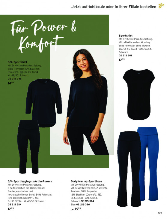 Bitte beachten Sie, dass dieser Text automatisch generiert wird und möglicherweise Fehler enthältJetzt auf tchibo.de oder in Ihrer Filiale bestellen ür Power 6 Sportshirt Mit Dry Active Plus-Ausrüstung. Mit reflektierendem Wording. 65% Polyester, 35% Viskose. TJ. Gr. XS 32/34 - XXL 52/54. Schwarz 02 215 301 12% 3/4-Sportieggings »ActivePower« Bodyforming-Sporthose Mit DryActive Plus-Ausrüstung. Mit DryActive Plus-Ausrüstung. 2 Seitentaschen am Oberschenkel. Mit ausgestellten Bein. 2 seitliche Breiter, elastischer und Taschen. 88% Polyester, hochgeschnittener Bund. 84% Polyester, 12% Elasthan (Creora®). @. 16% Elasthan (Creora®). @. Gr. S 36/38 - XXL 52/54. Gr. XS 32/34 - XL 48/50. Schwarz Schwarz 02 215 324 02215 319 Blau 02 215 326 299 Je 199° 123