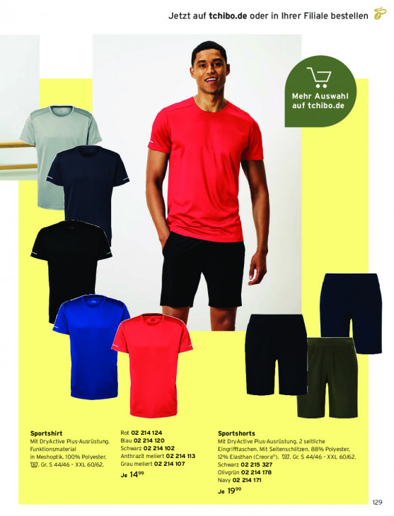 Bitte beachten Sie, dass dieser Text automatisch generiert wird und möglicherweise Fehler enthältJetzt auf tchibo.de oder in Ihrer Filiale bestellen Mehr Auswahl u auf tchibo.de u Rot 02 214124 Sportshirt Sportshorts Mit DryActive Plus-Ausrüstung. Blau 02 214 120 Mit DryActive Plus-Ausrüstung. 2 seitliche Funktionsmaterial Schwarz 02 214 102 Eingrifftaschen. Mit Seitenschlitzen. 88% Polyester, in Meshoptik. 100% Polyester. Anthrazit meliert 02 214 113 12% Elasthan (Creoraf). TA. Gr. S 44/46 - XXL 60/62. W. Gr. S 44/46 - XXL 60/62. Grau meliert 02 214 107 Schwarz 02 215 327 Je 14 Olivgrün 02 214 178 Navy 02 214 171 Je 19% 129