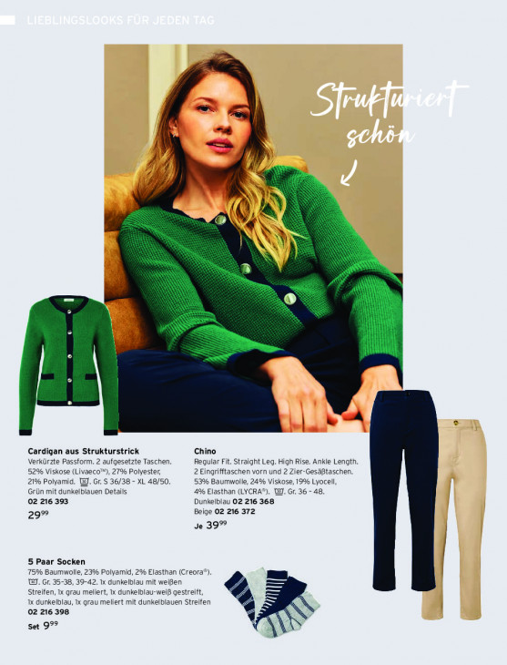 Bitte beachten Sie, dass dieser Text automatisch generiert wird und möglicherweise Fehler enthälta ). ch Fi 7 11 A m N Pr \ N à N N N SS all N N > ES 2 N à N N N = N N N à a À \ N N N N N à à Pi IN N AN \ SA Ki Ai N NS A à N) . N à ii D (N N | il B A | | | I il quil e Cardigan aus Strukturstrick Chino Verkürzte Passform. 2 aufgesetzte Taschen. Regular Fit. Straight Leg. High Rise. Ankle Length. 52% Viskose (Livaeco"”), 27% Polyester, 2 Eingrifftaschen vorn und 2 Zier-Gesäßtaschen. 21% Polyamid. : Gr. S 36/38 - XL 48/50. 53% Baumwolle, 24% Viskose, 19% Lyocell, ñ Grün mit dunkelblauen Details 4% Elasthan (LYCRA®). @. Gr. 36 -48. 02 216 393 Dunkelblau 02 216 368 292 Beige 02 216 372 Je 39% 5 Paar Socken 75% Baumwolle, 23% Polyamid, 2% Elasthan (Creora®). T1. Gr. 35-38, 39-42. 1x dunkelblau mit weißen Streifen, 1x grau meliert, 1x dunkelblau-weiß gestreift, 1x dunkelblau, Ix grau meliert mit dunkelblauen Streifen 02 216 398 Set 99°