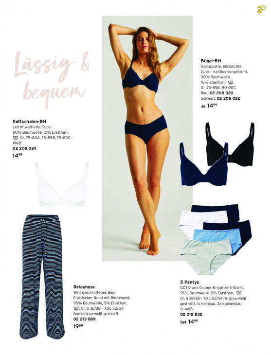 Bitte beachten Sie, dass dieser Text automatisch generiert wird und möglicherweise Fehler enthältBügel-BH Gedoppelte, blickdichte be Cups - nahtlos vorgeformt. v 90% Baumwolle, 10% Elasthan. @. Gr. 75-858, 80-90C. Blau 02 208 020 d Schwarz 02 208 022 Je 149° Softschalen-BH Leicht wattierte Cups. 90% Baumwolle, 10% Elasthan. I. Gr. 75-804, 75-858, 75-80C. Weiß 02 208 024 14% —— 5 Pantys Relaxhose GOTS! und Grüner Knopf zertifiziert. Weit geschnittenes Bein. 95% Baumwolle, 5% Elasthan. WI. Elastischer Bund mit Bindeband. Gr. S 36/38 - XXL 52/54. Ix grau-weiß 95% Baumwolle, 5% Elasthan. gestreift, Ix hellblau, 2x dunkelblau, W. Gr. S 36/38 - XXL 52/54. 1x weiß Dunkelblau-weiß gestreift 02 212 832 02 213 089 set 1499 1999