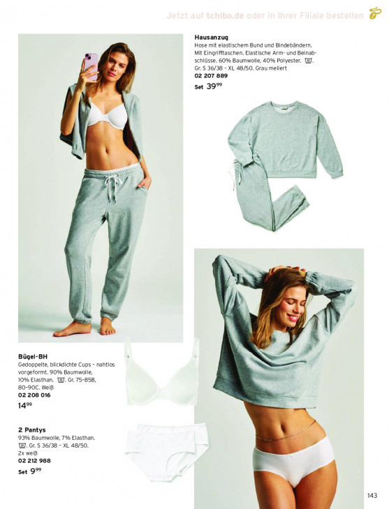 Bitte beachten Sie, dass dieser Text automatisch generiert wird und möglicherweise Fehler enthältHausanzug Hose mit elastischem Bund und Bindebändern. _ Mit Eingrifftaschen. Elastische Arm- und Beinab- schlüsse. 60% Baumwolle, 40% Polyester. @J. $ Gr. S 36/38 - XL 48/50. Grau meliert 02 207 889 Set 39% À > LI V2 sf 3 & RÉ es pr = À / " wu Se a 7 N I à à L G = à, Bügel-BH Gedoppelte, blickdichte Cups - nahtlos vorgeformt. 90% Baumwolle, 10% Elasthan. W@. Gr. 75-858, 80-90C. Weiß 02 208 016 145 2 Pantys 93% Baumwolle, 7% Elasthan. W. Gr. S 36/38 - XL 48/50. 2x weiß 02 212 988 set 9% 143