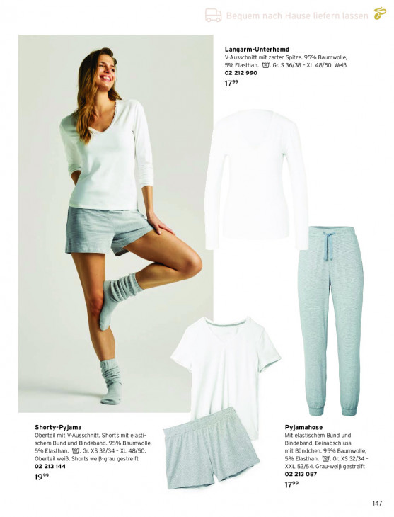 Bitte beachten Sie, dass dieser Text automatisch generiert wird und möglicherweise Fehler enthältLangarm-Unterhemd V-Ausschnitt mit zarter Spitze. 95% Baumwolle, 5% Elasthan. 18]. Gr. $ 36/38 - XL 48/50. Weiß 02 212990 k 17 kN / à — — À N ef ES V Shorty-Pyjama as Pyjamahose Oberteil mit V-Ausschnitt. Shorts mit elasti- Mit elastischem Bund und = schem Bund und Bindeband. 95% Baumwolle, î Bindeband. Beinabschluss 5% Elasthan. WJ. Gr. XS 32/34 - XL 48/50. = mit Bündchen. 95% Baumwolle, Oberteil weiß. Shorts weiß-grau gestreift 5% Elasthan. @. Gr. XS 32/34 - 02 213144 = XXL 52/54. Grau-weiß gestreift = — _ 02 213 087 19% — 17% 147