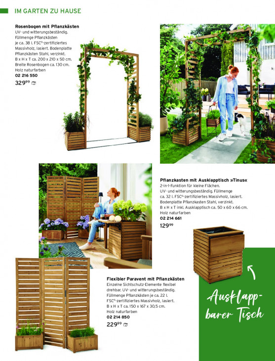 Bitte beachten Sie, dass dieser Text automatisch generiert wird und möglicherweise Fehler enthältIM GARTEN ZU HAUSE Rosenbogen mit Pflanzkästen UV- und witterungsbeständig. Füllmenge Pflanzkästen je ca. 38 1. FSC*-zertifiziertes 5 T a de = EN Massivholz, lasiert. Bodenplatte Pflanzkästen Stahl, verzinkt. > Bx Hx T ca. 200 x 210 x 50 cm. ENV Re x mM Lu Breite Rosenbogen ca. 130 cm. a Holz naturfarben 2. = 02 216 550 | 329° © 0 LS | al 3 | [Ld 4 | Sik: (A / h I AS A zE I dd = Pflanzkasten mit Ausklapptisch »Tinus« = 2-in1-Funktion für kleine Flächen, (=== mm ed v UV- und witterungsbeständig. Füllmenge ca. 32 1. FSC*-zertifiziertes Massivholz, lasiert. an pl Bodenplatte Pflanzkasten Stahl, verzinkt. 3 = zeen BxHxT inkl. Ausklapptisch ca. 50 x 60 x 66 cm. Holz naturfarben 02 214 661 en ‚2 ch ® 1299 D SS N BES NS m. er = | EA N = Flexibler Paravent mit Pflanzkästen Einzelne Sichtschutz-Elemente flexibel Ps = drehbar. UV- und witterungsbeständig. Füllmenge Pflanzkästen je ca. 22 1. ES, FSC*-zertifiziertes Massivholz, lasiert. BXHXT ca. 150 x 167 x 30,5 cm. Cd à Holz naturfarben Ze! 02 214 850 barer nt se] 229° & | LIL = La