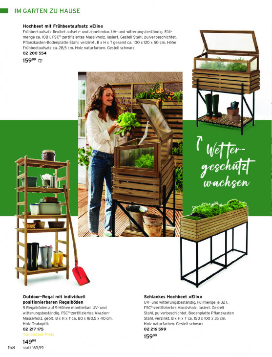 Bitte beachten Sie, dass dieser Text automatisch generiert wird und möglicherweise Fehler enthältIM GARTEN ZU HAUSE = Hochbeet mit Frühbeetaufsatz »Elin« Frühbeetaufsatz flexibel aufsetz- und abnehmbar. UV- und witterungsbeständig. Füll- menge ca. 108 I. FSC*-zertifiziertes Massivholz, lasiert. Gestell Stahl, pulverbeschichtet. Pflanzkasten-Bodenplatte Stahl, verzinkt. Bx H x T gesamt ca. 100 x120 x 50 cm. Höhe Frühbeetaufsatz ca. 28,5 cm. Holz naturfarben. Gestell schwarz 02 200 554 pn 159% & — Ar m % (4 Sr À % Se warm NE = We LENS en es NI ; u 271 =, 4 ES 5 7] Pe, ms - her I id re Tm dd = = — Al 8 ‚8 Va 48 eef 7 u 277 KI LE Un, M DS 7 — EN N G LS N W N A | (A | e ZI > | Outdoor-Regal mit individuell Schlankes Hochbeet »Elin« positionierbaren Regalböden UV- und witterungsbeständig. Füllmenge je 32 1. FSC*-zertifiziertes Massivholz, lasiert. Gestell 5 Regalböden auf 9 Höhen montierbar. UV- und witterungsbeständig. FSC*zertifiziertes Akazien- Stahl, pulverbeschichtet. Bodenplatte Pflanzkasten Massivholz, geëlt. B x H x T ca. 80 x 180,5 x 40 cm. Stahl, verzinkt. B x H x T ca. 150 x 100 x 35 cm. Holz naturfarben. Gestell schwarz Holz Teakoptik 02 217 175 02 216 599 159% 149°° 158 statt 169,99