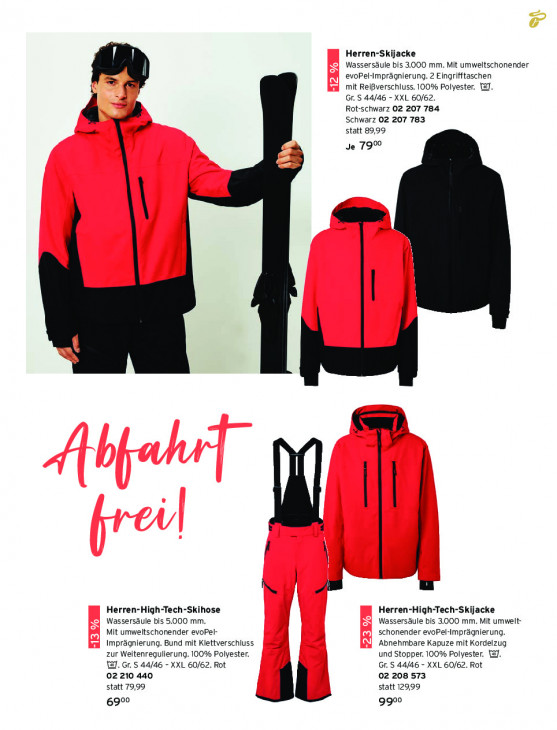 Bitte beachten Sie, dass dieser Text automatisch generiert wird und möglicherweise Fehler enthältHerren-Skijacke Wassersäule bis 3.000 mm. Mit umweltschonender evoPel-Imprägnierung. 2 Eingrifftaschen mit Reißverschluss. 100% Polyester. WJ. 5 Gr. S 44/46 - XXL 60/62. Rot-schwarz O2 207 784 Schwarz 02 207 783 4 statt 89,99 Je 7900 | | | Herren-High-Tech-Skihose Herren-High-Tech-Skijacke Wassersäule bis 5.000 mm. Wassersäule bis 3.000 mm. Mit umwelt- Mit umweltschonender evoPel- schonender evoPel-Imprägnierung. Imprägnierung. Bund mit Klettverschluss ‚Abnehmbare Kapuze mit Kordelzug zur Weitenregulierung. 100% Polyester. und Stopper. 100% Polyester. a]. WI. Gr. S 44/46 - XXL 60/62. Rot Gr. 5 44/46 - XXL 60/62. Rot 02 210 440 02 208 573 statt 79,99 statt 129,99 6900 9900