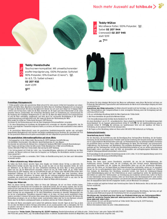 Bitte beachten Sie, dass dieser Text automatisch generiert wird und möglicherweise Fehler enthältNoch mehr Auswahl auf tchibo.de > F Teddy-Mütze Microfleece-Futter. 100% Polyester. @J. Salbei 02 207 944 L29 % Cremeweiß 02 207 945 statt 999 Je 700 Teddy-Handschuhe Touchscreen-kompatibel. Mit umweltschonender evoPel-Imprägnierung. 100% Polyester. Softshell Erea 90% Polyester, 10% Elasthan (Creora®). WJ. Gr. 6,5, 7,5. Salbei-schwarz 02 207 932 statt 12,99 goo 1, Freinlliges Rückgaberec Sie müssen für einen engen Wertverlust der Waren nur aufkommen wenn dieser Wertverlust auf einen zur 1. Ehibo genäht neben dem gesetzichen Widerrufsrecht (br ve unserr Arie fi Ausnahme von Lebens Prüfung er Beschaffenheit Eigenschaften und Funkionswese der Waren ich noinendigen Umgang mi nen mitteln und Yafee-bos Maschen im kombinieren Kafee bo) ein riiliges Rückgaberech von insgesamt zielen st 30 Tagen ab Narenerhat Mi diesem Richgaerecht können Sie sich auch nach Ab der tige Hider Ausschluss des Widerrufsrechts: in Widerrufsrecht bstet nich! ba Verträgen zur Lifeung von Tor Fufstst vom Vertrag Esen, indem Sie ie Ware imertab von 3 Tagen nach deren Warenerha an ie unten der Videoaufnahmen oder Compulersotvar in ner versiegelen Packung, en ce Versiegelung nach der, genannte Adresse zurücksenden. Die rechlzeige Absendung rich zu Fstahrung aus. Voraussezung für Ueferung enter! wurde. die Ausübung des reivigen Rücigaberechs L das für di War das Wierfsrechl nicht ausgeschlossen 5.Bis zu olständigen Bezahlung ib ie Ware Eigentum der Tehibo GmbH ist und di Ware volänfg, ungerauch und ohne durch Se verusachle Beschädigung in er Orina- 6. Ale Preise beinhalten die geselziche Nehneriteuer. erlaufsvepäckung riches ir, Wir rage ie Hasen der Rücksendung der Ware. De Versandkosterpauschak elrägt eulschndwlt nur € 495 Bitte senden Se Ark! an. co GmbH Relourn, 2879 Bremen. ie können ie Rücksendung auch den der Ware biegen Relourenaukleber verwenden. Ab einem Besleert von € 29; vrsandhostenfrei Davon abneichend beträgt die Versandhostenpauschale 2. für ie Rückzahlung bei Ausübung des Rückgaberecht verwenden wir assebe Zahlungsmittel, das Se deutschlandweit für als Sperrgut gekennzeichnete Artikel € 4,95 GD, für als Speditionsielerung gekenn Bei er usprüngichen Transaktion eingeselzt haben, seidenn, mit Ihnen wurde ausrückich eas anderes zaling Alikel € 2, CS. Bei Ueferung von Speionsnare slz sich der Spedieur mi Ihnen in vereinbar. Verbindung, um den gnauencerermin abzusprechen 8.Bai ragen zu er Bestelung stehen wir men unter 020-6007 900 eeonisch zur Vertigung 3. Ihr gesetriches Widerrufsrecht sowie die gesetzlichen Gewährkeistungsteche werden von vertraglich Datenschutzhinweis: ingeräumlen Aückgaberech nich! berür! und ieen unabhängig hiervon besehen Bis zum Alu de Fr ir as gestzicheHidersrecht geilen auschiiich di dor aufgeführten gesezichen Beingungen. Verarbeitung durch Tchibo ‘gesetzlichen Informationspl ut einen Bic Für den Abschuss, di Durchführung der ie Beendigung Ihres Vetragesiher Bestelung, bei der Kunden- Beirenung. ba der Ausieerungunserer Produ sone beider Erstellung dem Versand unsterog.ersänch 1. Vertragspartner ist ie Thibo Gmb Überseeing 8, 2297 Hamburg. Geschäftsührung: aufsie ageschnitenen erbemaleiien sowie gl zur Riskamininierung von Zahlungsaustäen verarbeiten Erik Hofer (Vorsitzender), Fl Abrechl, Hamid Dsstalchian Dr. Jens Kôppen ir persönliche Daten von Ihnen. Hierzu zählen Beispieiseise hr Name, re Rechnungs: und Ueferanscr, Vorsitzender des Aufsichtsrat: Michad Herz Amisgerchl Hamburg HA 4308. Eventuee Beanstantungen Adresse Ihre Rechnungs: und Bzahlaten le geläliien eslelungen Soie gt. Ihr Geburtsdatum der Fragen zum Vertrag ichlen Se be an den Tchibo Best eleve EME seniceGchbo de und/oder og. hr elelommummer Im fall einer Bniäisprüfung behalten wir uns vor, weier aressbeogene Teen: 40 40077 900 Post Th Gl, Überseeing 8,297 Hamburg Benertungen extern amufragen sou mit He von geospzälen und auflragsbezogenen Merkmalen eine 2.Der Vertrag lommt mit Erhalt der Lier bzw. Versandbesäigug, säestens mit Ausieerung der Ware. mögliche Zahlungsusklwahrscheinlichkeil zu berechnen Zustande. Au Ynsch stelen wir Ihnen den Vertragse ur Vertigung re Bestellen werden In unserem Hause gespecert, Rechtsgrundage für di genannten Verarbeitungszwece ist Art. Abs.) Vrtragsabnicklung)sowieArt.&| 3.Um Forderungsausäle zu vermeien, führt Khibo in Boniässcoring durch, ei dem auch Adressdaten Abs 1D EUDSGIO (Werbung und Bonfäsprüfurg) verwendet werden. Weitergabe von Daten 4. Widerrufsbelehrung: Widerrufsrecht. Werden re Daten durch unsere Dienstester verarbïle, die uns bei der Kundenbetreuung. der Se haben das Rech, binnen vierzehn Tagen ohne Angabe von Grinden diesen Verra zu wideruien. Die ‚Auslieferung unserer Produkte sowie bei der Erselung und dem Versand unserer Werbematerialen erst bet vzehn age a dem Tg, an dem Sie oder ein vor nen benam Die, der nicht unterstützen, beschränkt sich der Umfang der übernitelen Dalen nur auf das erfordeiche Minimum. der Beördrer il. de Waren bw. bi einer einhelichen Bestlung Ge lelie Vare in Betz genommen Solem wir hr Daten zur Vertragserfülung an Kooperationspatner weergebe, wesen wir Sie gesonder haten bzw hat. U Ihr Widerrufsrecht auszuüben, missen Se uns de Klo Gm, zR an. Tchibo GmbH, Riera in. Die so weiergegebenenDalendirfen von unseren Kooperalonspariiem Igich zu Erlilung Überseering I 223 Haribrg, oder an senieicho.de oder per Tell unlr 090-0 7900 mitiis aner ihrer Aufgabe, de Abckling Ihrer Bsielung, verarbeitet werden. Zum Zwech der Sendungsverfolgung eindeuligen Erklärung (zR. en mit der Post versander Brel oder Ei) ber Ihren Enschluss, diesen sou Paelankindigung geben wir Ihre EMahAdresse an unsre Lgistgarier wie. Bei Selionsare Vertrag zu widrufen, informieren. ie können dar das der Lieferung beigefügte Muse Midernfsormulr Übermitte wi zuiem he Telefonnummer zur Vereinbarung eine ko