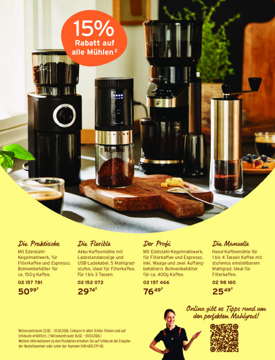 Bitte beachten Sie, dass dieser Text automatisch generiert wird und möglicherweise Fehler enthält1] il 1 M WL | | —— ij L [1 Ar r vw 8 EE 4 | mt u —ÿ —— = a u Die Praktische Die Flexible Der Profi Die Manuelle Mit Edelstahl- Akku-Kaffeemühle mit Mit Edelstahl-Kegelmahlwerk, Hand-Kaffeemühle für Kegelmahlwerk, für Ladestandan: und für Filterkaffee und Espresso. 1bis 4 Tassen Kaffee mit Filterkaffee und Espresso. USB-Ladekabel Mahlgrad Inkl. Vaage und zw Auffang stufenlos einstellbarem Bohnenbehälter für stufen deal für Filterkaffee. behältern. Bohnenbehälter Mahlgrad. I al für Für 1 bis 3 Tassen Filterkaff ca. 150g Kaffee. für ca. 400g Kaffe 02 157 781 02152 072 02157 466 02 98 160 50°* 297 76: 254* Online gibt es Tipps rund um © den perfekten Mohlyod! ‘Aktionszeitraum: 23.02. 01032 xklusivin alen Tchibo Filialen und auf © # tchibode erhältlich.|#Aktio traum: 16.02. 01032026 | Weitere Informa n zu den Pr ukten erhalten Sie auf 0.de bei Eingabe der Bestellnummer der unter der Nummer 040: oo. Rel kie