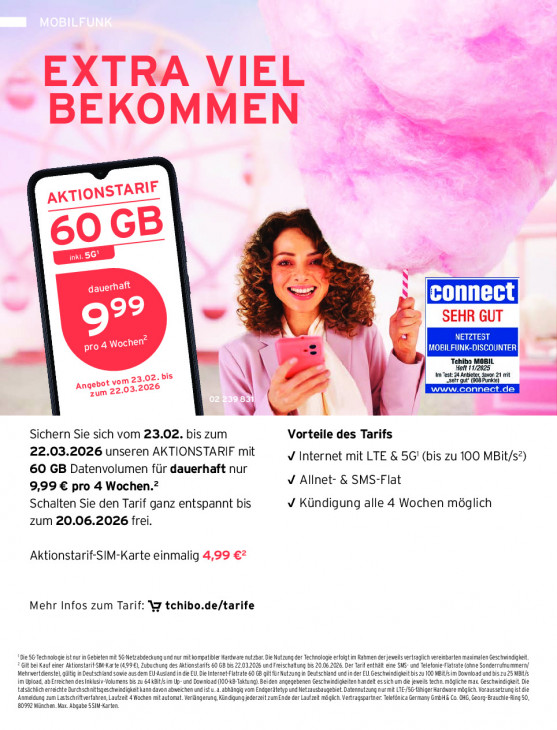 Bitte beachten Sie, dass dieser Text automatisch generiert wird und möglicherweise Fehler enthältEXTRA VIEL % ze ” BEKOMMEN ® me LONSTARIF 9. E dauerhaft onnec SEHR GUT 9°? NETZTEST 4 pro 4 Wochen MOBIL FUNK: ui Tehiba MOBIL N Heft 11/2025 mest, Str Angebot vo! m 23.02. bis 03.2026 Sichern Sie sich vom 23.02. bis zum Vorteile des Tarifs 22.03.2026 unseren AKTIONSTARIF mit v Internet mit LTE & 5G' (bis zu 100 MBit/s?) 60 GB Datenvolumen für dauerhaft nur v Allnet- & SMS-Flat 9,99 € pro 4 Wochen.? Schalten Sie den Tarif ganz entspannt bis v Kündigung alle 4 Wochen möglich zum 20.06.2026 frei. Aktionstarif-SIM-Karte einmalig 4,99 €? Mehr Infos zum Tarif: X tchibo.de/tarife De SC Technologie istnur in Gebieten mit SG-Netzabdeckung und nur mit kompatibler Hardware nutzbar. Die Nutzung er Technologie erfobgt im Rahmen derjeneis vertraglich vereinbarten maximalen Geschwindigkeit Fit bei Kauf einer Aktionstari SM-Karle (499), Zubuchung des Aktionstais 60 G bi 22.032026 und Freischaltung is 20.06.208.Der Tri enthält ine SMS- und Telefonie Flatrate (cine Sonderrufnummern/ Mehrwerldiensle) gli in Deutschland sonie ausdem EU-Auslad indie EU. Die Interne atrae & G8 il für Nutzung in Deutschland und inder EU Geschwindigkeit is zu 00 MBit/sim Download und bis zu 25 MB. im Upload, ab Erechen des Inkusiv-Volumens bis zu 64kit/sim Up-und Download (00-kB-Taklung). Beiden angegebenen Geschwinigkeiten handel essich un ie jeeistechn.mögliche max. Geschwindigei.Die tatsächlich erreichte Durchschiisgeschwindigkei kann davon abneichen und ist u.a. abhängig vom Endgerätehyp und Nelzausbaugebie.Datennutzung nur mit LTE/SGThiger Hardnare möglich Voraussetzungistdie Anmeldung zum Lastschrftverfahren,Lauzei 4 Wochen mitautomat. Verlängerung. Kündigung jederzeit zum Ende der Laufzeit möglich. Vertragspartner. Telefänica Germany GmbH& Co. OHG, Georg-Brauchle-Ring 50, 80992 München. Max. Abgabe 5SIM-Krten.