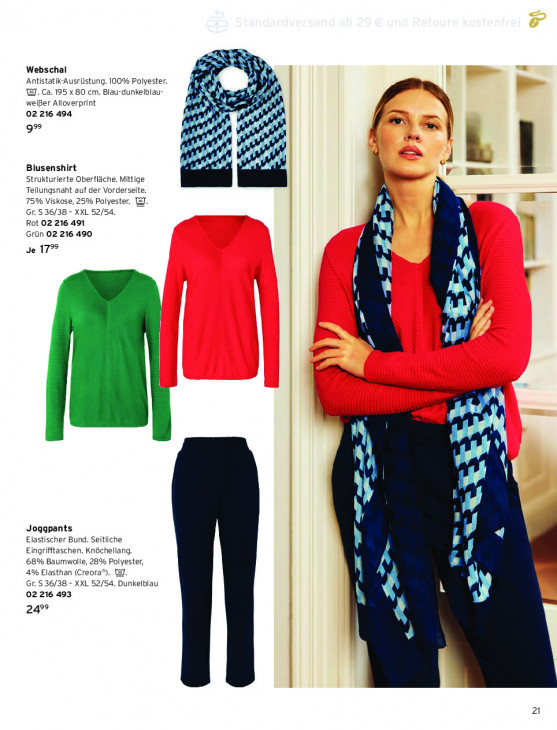 Bitte beachten Sie, dass dieser Text automatisch generiert wird und möglicherweise Fehler enthält3 Webschal ca" # Antistatik-Ausrüstung. 100% Polyester. 7, 9. Ca. 195 x 80 cm. Blau-dunkelblau- Si MIK weißer Alloverprint = ES OPZ " pe Se P x 02 216 494 à jj Af 5, Ne 9° M Ml ar Ÿ,, sp, 7 à ve, Es a7, ij # Blusenshirt Cr, We Strukturierte Oberfläche. Mittige Teilungsnaht auf der Vorderseite. 75% Viskose, 25% Polyester. WJ. Gr. S 36/38 - XXL 52/54. Rot 02 216 491 Grün 02 216 490 Je 17° = )) Ç LS N # eve N LA f LE 1 R bl! PE |} nd id { 0 Joggpants F Elastischer Bund. Seitliche Eingrifftaschen. Knöchellang. 68% Baumwolle, 28% Polyester, GP 4% Elasthan (Creora®). @. Gr. S36/38 - XXL 52/54. Dunkelblau 02 216 493 499 21
