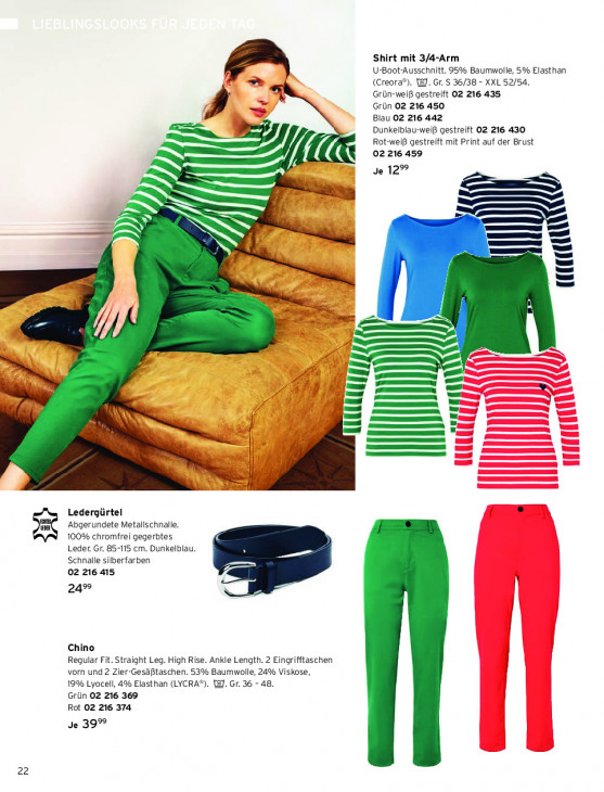 Bitte beachten Sie, dass dieser Text automatisch generiert wird und möglicherweise Fehler enthältShirt mit 3/4-Arm U-Boot-Ausschnitt. 95% Baumwolle, 5% Elasthan (Creora®). @. Gr. S 36/38 - XXL 52/54. Grün-weiß gestreift 02 216 435 Grün 02 216 450 Blau 02 216 442 Dunkelblau-weiß gestreift O2 216 430 Rot-weiß gestreift mit Print auf der Brust 02216 459 Je 12% SS QII NNS mn LI we 5 mm | = di a Na, in = — | Ledergürtel Abgerundete Metallschnalle. 100% chromfrei gegerbtes Leder. Gr. 85-115 cm. Dunkelblau. Schnalle silberfarben 02 216415 24® Chino Regular Fit. Straight Leg. High Rise. Ankle Length. 2 Eingrifftaschen vorn und 2 Zier-Gesäßtaschen. 53% Baumwolle, 24% Viskose, 19% Lyocell, 4% Elasthan (LYCRA®). @J. Gr. 36 - 48. Grün 02 216 369 Rot 02 216 374 Je 39% 22