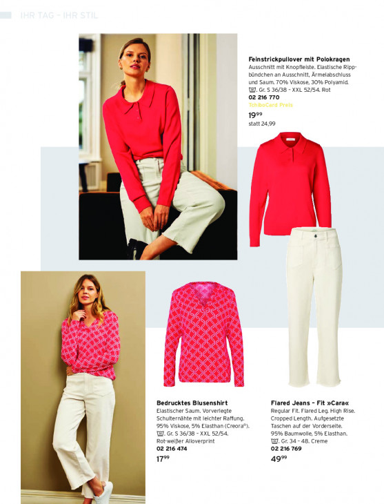 Bitte beachten Sie, dass dieser Text automatisch generiert wird und möglicherweise Fehler enthältFeinstrickpullover mit Polokragen à ‚Ausschnitt mit Knopfleiste. Elastische Ripp- bündchen an Ausschnitt, Ärmelabschluss und Saum. 70% Viskose, 30% Polyamid. WI. Gr. 5 36/38 - XXL 52/54. Rot 02 216 770 1999 statt 24,99 | EE Mr 4 x ER sy > RER ie Ne X STO * N gs € Y y X Id À % % De Te 7 € IQ X X ij I 0 x x € Bedrucktes Blusenshirt Flared Jeans - Fit »Cara« Elastischer Saum. Vorverlegte Regular Fit. Flared Leg. High Rise. Schulternähte mit leichter Raffung. Cropped Length. Aufgesetzte 95% Viskose, 5% Elasthan (Creora®). Taschen auf der Vorderseite. WI. or. S 36/38 - XXL 52/54. 95% Baumwolle, 5% Elasthan. Rot-weifer Alloverprint W. Gr. 34-48. Creme 02 216 474 02 216 769 { 17% 49%